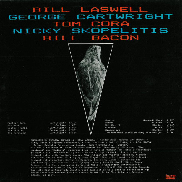 Bill Laswell is probably the most "famous" musician on Curlew's eponymous debut LP, and it's interesting to note that not only had he not fallen into his more well-known ambient dub persona at the time of this 1980 recording — but the first Material album had not even been released, nor his first solo effort, Baselines. On tracks like the opening "Panther Burn" his slippery, rubbery bass is all over the place and far from deep and dubby. Laswell is more interested in playing in-your-face funk-jazz than in building up layers of "atmosphere" (although there is atmosphere of a different sort on the collective improv "But Get It," spacious but disturbed more than calming), and the same goes for guitarist Nicky Skopelitis, a future ongoing partner in Laswell's sonic universe who emerges as a fleet-fingered fusoid six-stringer here (check out "Bitter Thumbs"). Drummer Bill Bacon from Material alternately nails the groove and rolls and tumbles along, and cellist Tom Cora makes every effort to transport his instrument as far as possible from the world of "chamber music" — his earthy and abrasive tone and jagged interjections are as wonderful on this disc as they ever would be (and his "Rudders" is a great Curlew tune). Then of course there is the leader, and while Cartwright can wail with the best of them, he is more interested in a group sound than in hogging the solo spotlight, as he would continue to prove through numerous Curlew incarnations (later featuring Pippin Barnett on drums and Davey Williams on guitar and a shifting cast of avant luminaries such as Fred Frith, Anton Fier, Wayne Horvitz, Ann Rupel, Samm Bennett, Kenny Wollesen, and Fred Chalenor) on Cuneiform albums up to and including 2003's Mercury. With his sax staking out territory somewhere between R&B, funk, harmolodics, and free jazz/improv, screaming with passion one moment and rolling out an insistently catchy and good-natured melody the next, you might wonder if downtown avant types were thrown into a conundrum at Curlew gigs: "Will we still be hip if somebody catches us dancing the Funky Chicken to this stuff?"