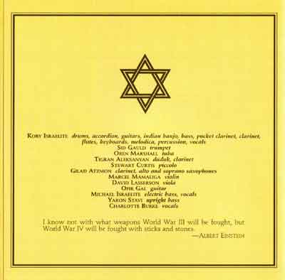 Koby Israelite: drums, accordion, guitars, indian banjo, bass, pocket clarinet, clarinet, flutes, keyboards, melodica, percussion, vocals;